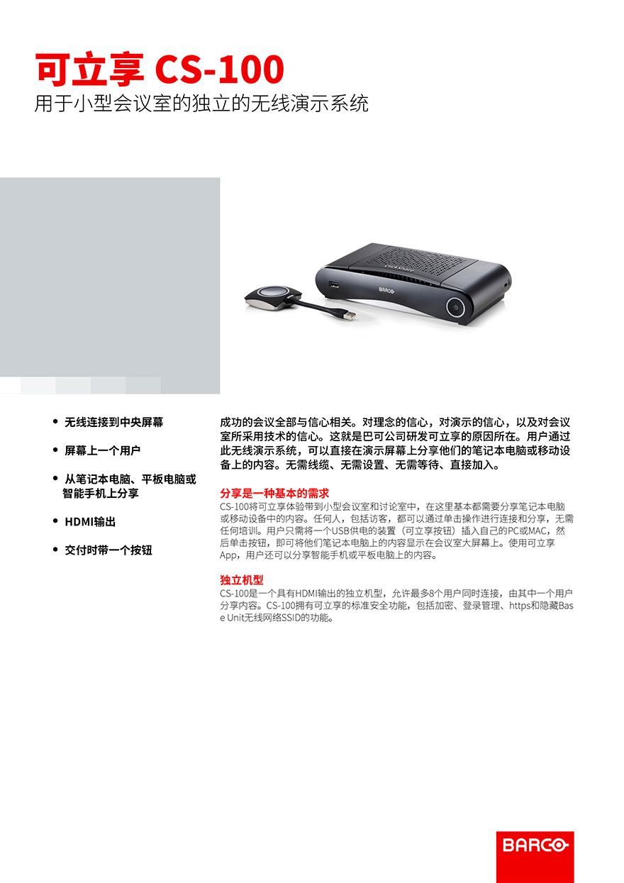 巴可BARCO Clickshare可立享CS-100無線演示協作系統