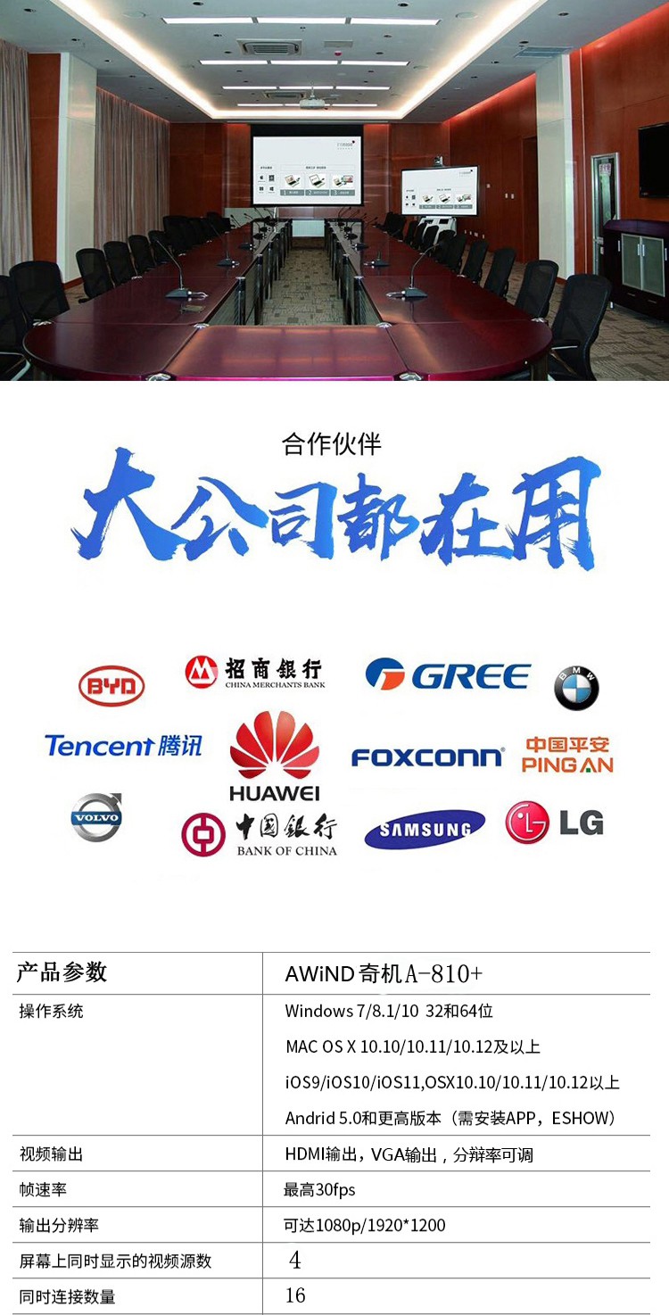 AWiND奇機(jī)無(wú)線會(huì)議投屏A-810+一鍵聯(lián)無(wú)線投屏手機(jī)平板電腦一對(duì)多無(wú)線投屏器